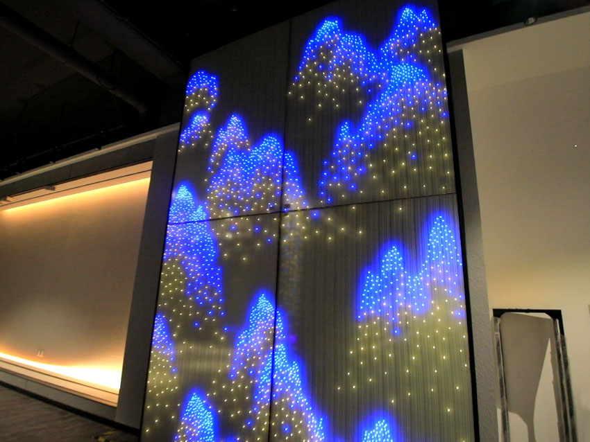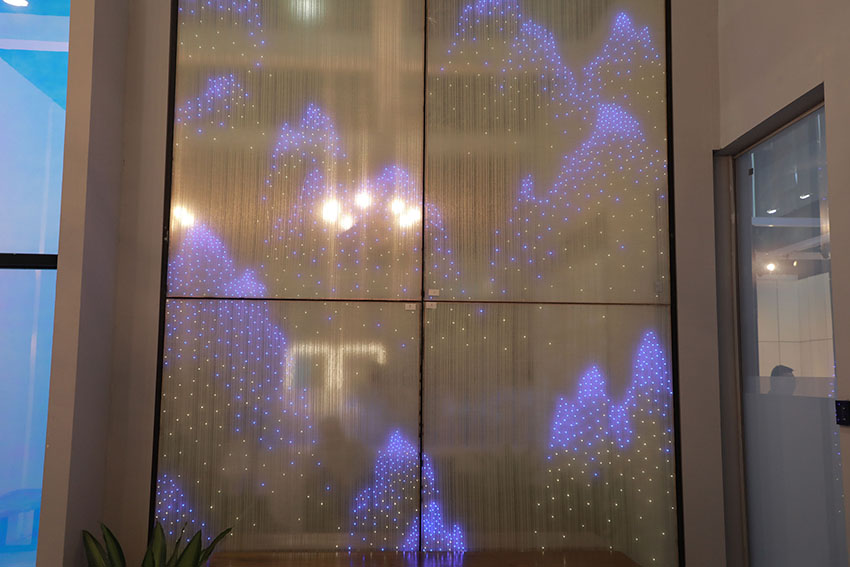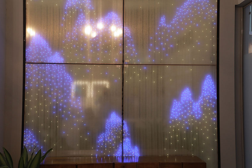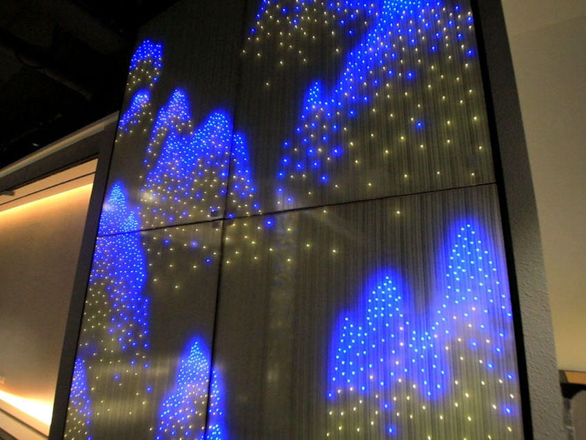 構(gòu)筑空間的美感,營造獨(dú)特的空間魅力,高密度的點(diǎn)點(diǎn)LED光源,通過不同燈光顏色的組合,在玻璃上鑲嵌出了一幅山峰高低起伏的圖畫。原本平面的玻璃背景墻,呈現(xiàn)出立體的觀感。